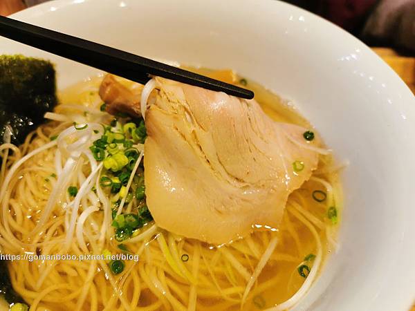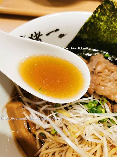 等了約10分鐘,拉麵就上桌了,豬肉白醬油拉麵湯頭清澈見底,配料就是簡單的一片豬肉叉燒、筍乾、豆芽菜和海苔。