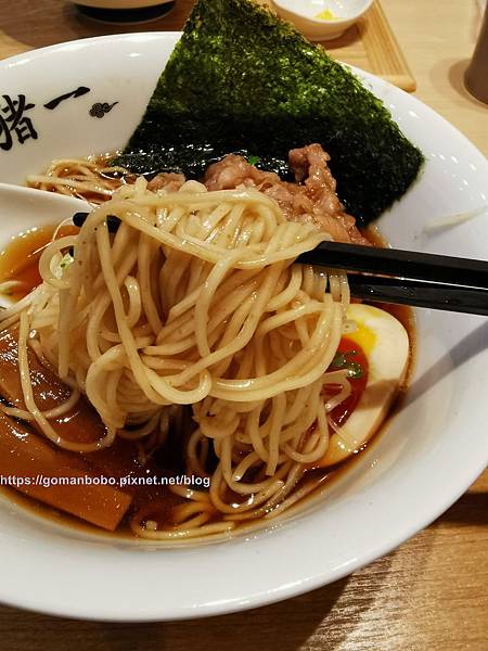 拉麵採用細麵條,非常的Q彈有嚼勁,完全能吸附醬油湯頭。
